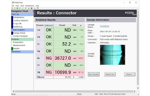 The optional screening analysis kits allow even beginners to start RoHS, halogen, or antimony screening analysis right from the day of purchase. Simply mount the sample, select the analysis conditions, enter the sample name, and wait for the results. The analysis results are displayed with a pass/fail evaluation after just a few minutes.