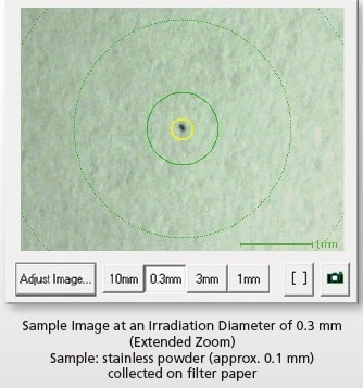 The irradiation diameter automatically switches between 0.3, 1, 3, and 10 mm in diameter. This system supports not only the analysis of small spots but also macro composition analysis at 10 mm in diameter.