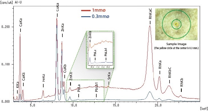 A small metal powder approximately 0.1 mm in diameter adhered to the commercially available snacks was analyzed with irradiation diameters of 1 mm and 0.3 mm respectively. At an irradiation diameter of 1 mm, the overall background is significantly increased due to the influence of scattered X-rays from the surrounding area of the metal powder (snacks), resulting in a poor S/N ratio. At an irradiation diameter of 0.3 mm however, the influence of scattered X-rays from the surrounding area is small, and peak profiles with a good S/N ratio are obtained.Copper (Cu) and Zinc (Zn) are detected as the major component with both irradiation diameters. It indicates that the metal powder is brass regardless of the irradiation diameter used. However, at 0.3 mm in diameter, the peak of Lead (Pb) is also identified, which suggests that the metal powder is not only the brass, but the "free cutting brass" contains Lead.