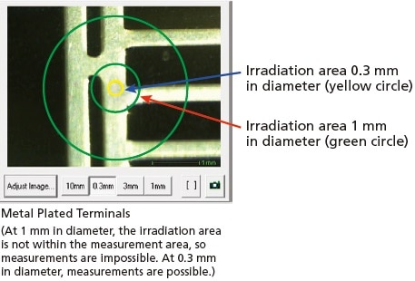 When film thickness measurements are performed with the calibration curve method or the thin-film FP method, the sample (measurement position) must be larger than the X-ray irradiation diameter. This system supports film thickness measurements for small spots of plating, which were difficult at an irradiation diameter of 1 mm.